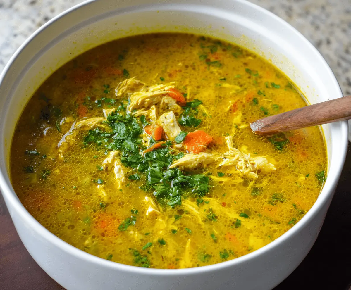 This nourishing turmeric chicken soup is packed with anti-inflammatory ingredients like ginger, turmeric, and black pepper, combined with hearty chicken and vegetables for a comforting and healthy meal.