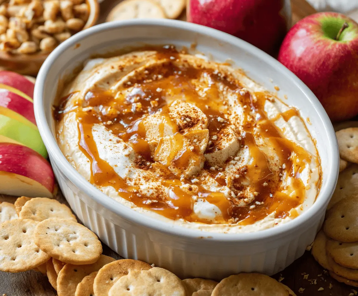 Creamy apple cheesecake dip topped with caramel sauce for a sweet indulgence.