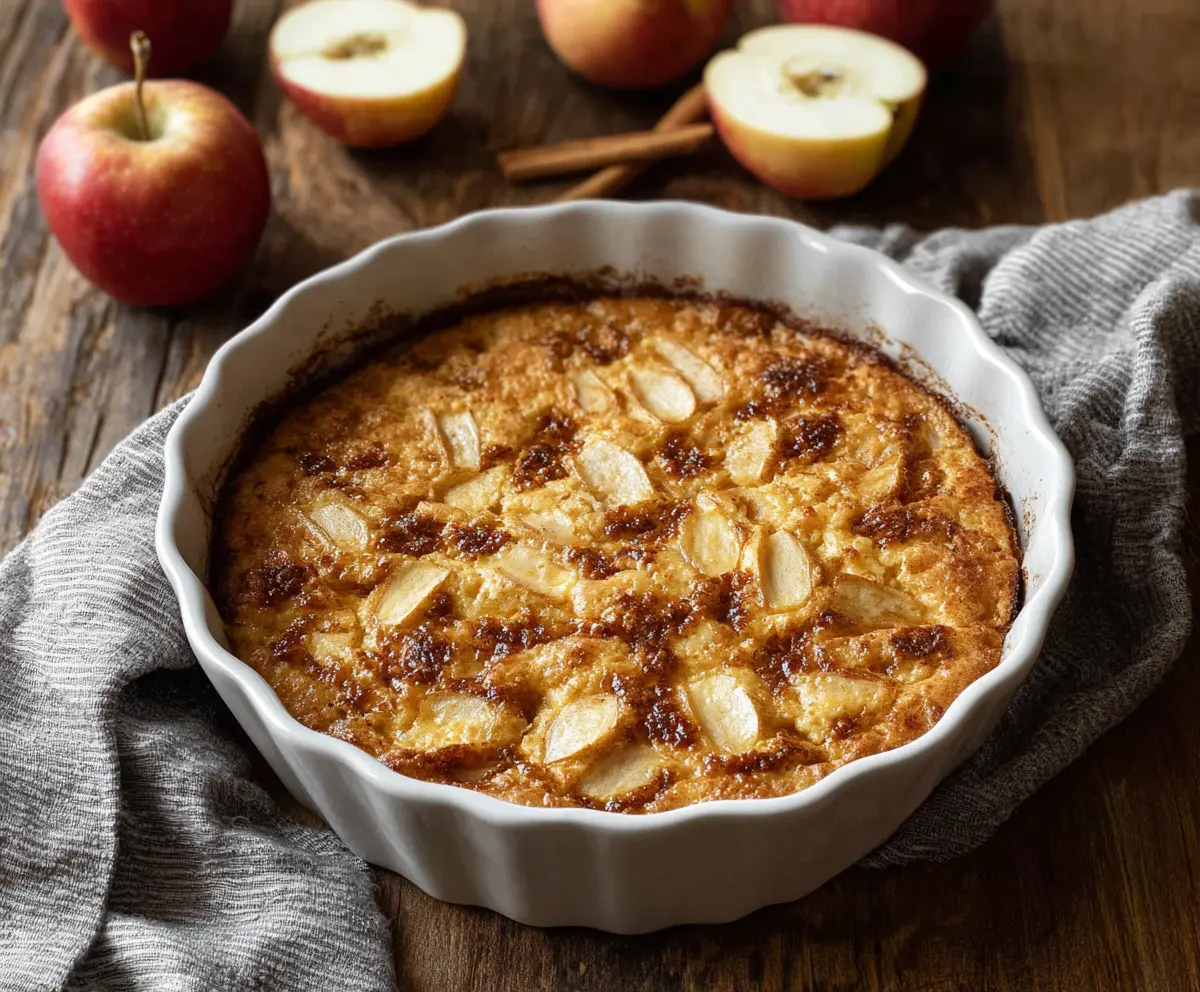 Delicious Apple Cinnamon Cottage Cheese Bake served in a baking dish, topped with cinnamon and fresh apple slices.