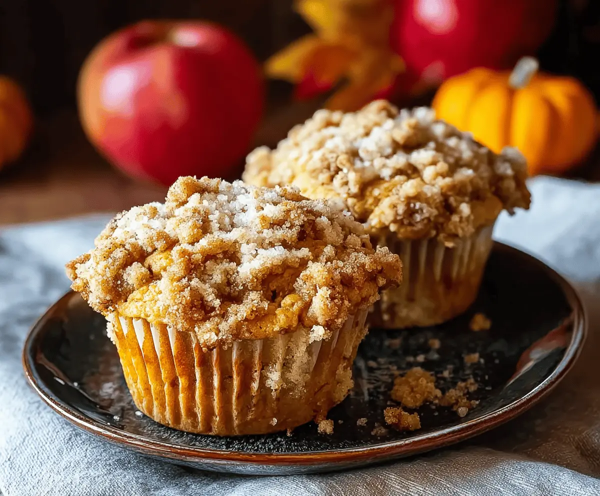 Delicious apple pumpkin streusel muffins with golden tops and crunchy streusel topping on a plate, perfect for fall baking.