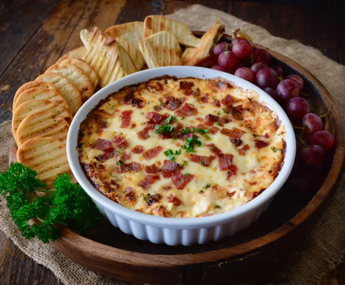 Enjoy this rich and creamy smoky cheese and bacon dip, perfect for parties or casual gatherings!