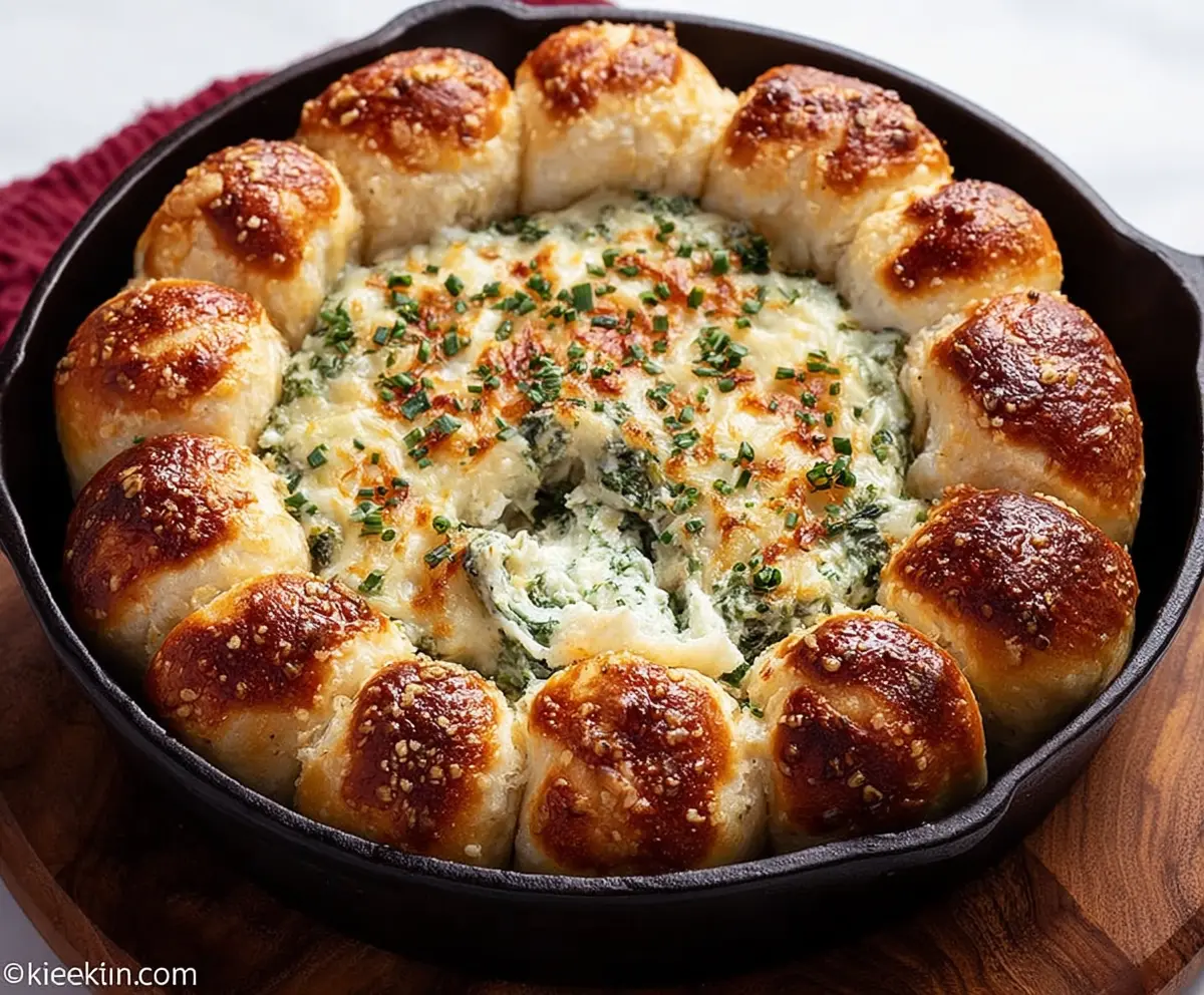 Enjoy this warm, cheesy, spinach-packed dip surrounded by soft, fluffy baked biscuits—the perfect party centerpiece!