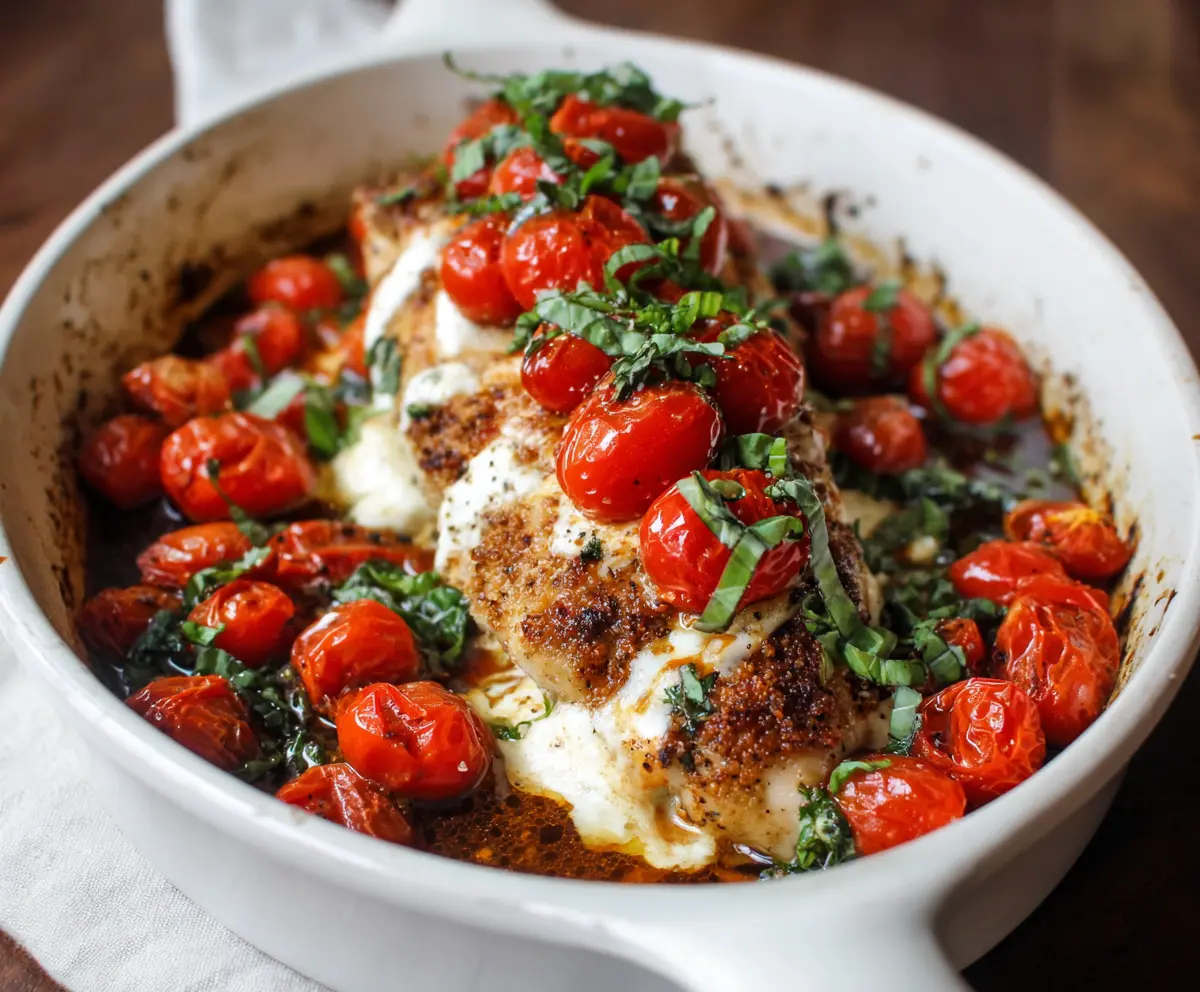 This Baked Caprese Chicken is a delicious treat! Juicy chicken breasts are topped with fresh tomatoes, creamy mozzarella, and fragrant basil for a meal that feels fancy but is super easy to make.