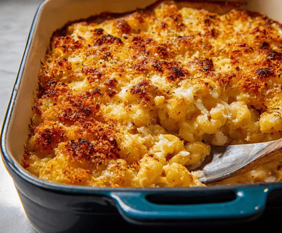 Delicious baked mac and cheese served in a casserole dish, topped with golden breadcrumbs.