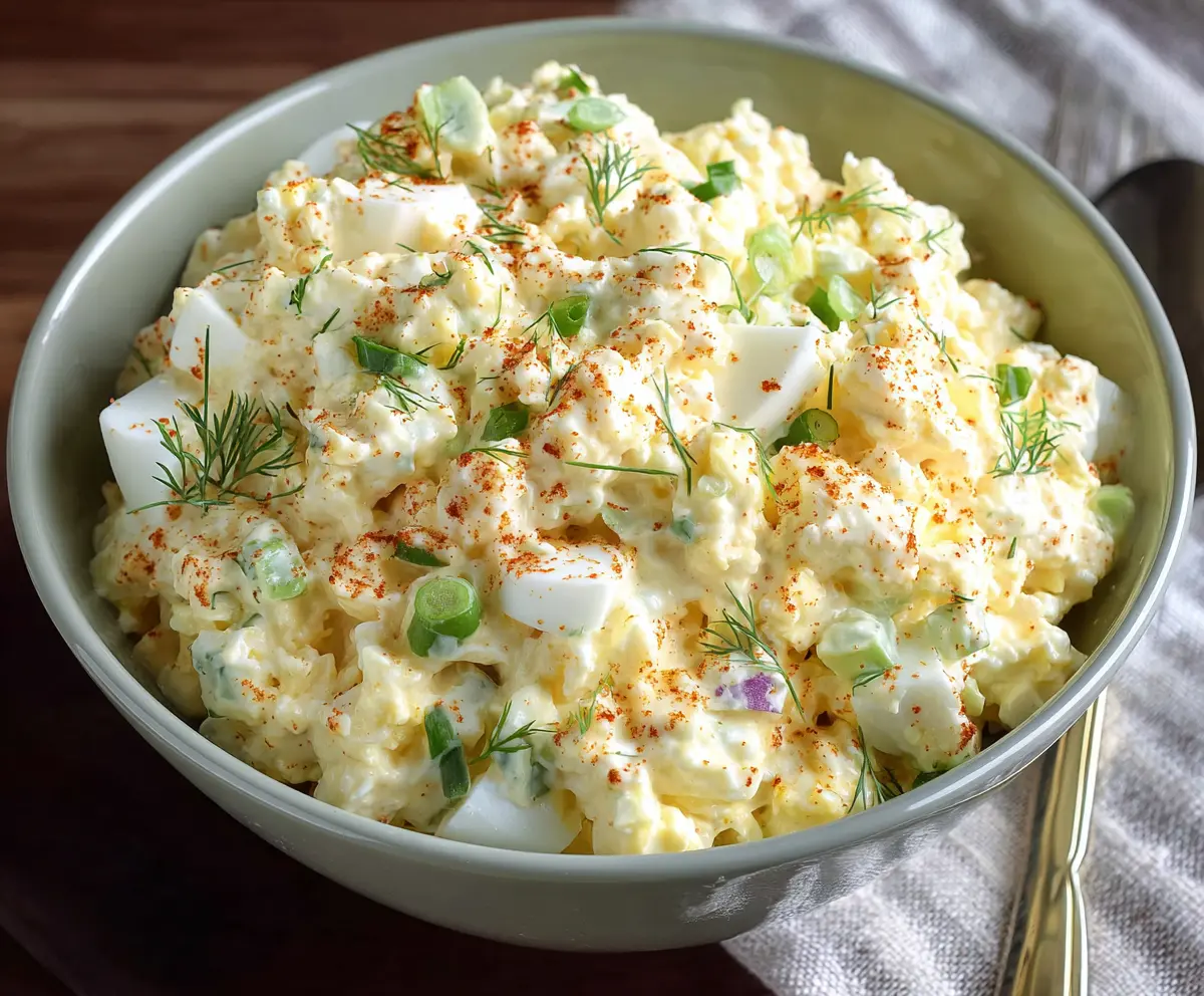 Transfer the delicious egg salad into a serving bowl. Sprinkle a little paprika on top for a pop of color, and if you like, garnish with fresh parsley sprigs for an extra touch.