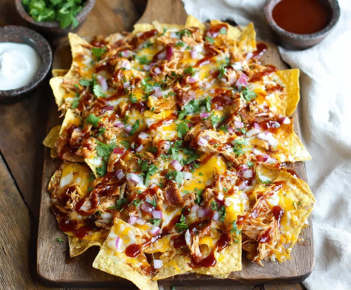 BBQ Chicken Nachos are a fun and tasty dish! Picture crispy tortilla chips piled high with tender BBQ chicken, melted cheese, and tasty toppings like jalapeños and sour cream.