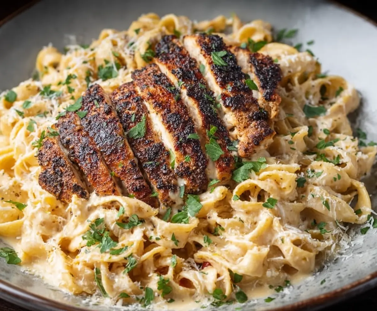Now it’s time to plate! Serve the creamy pasta onto dishes and top with those juicy strips of blackened chicken. Finish with a sprinkle of freshly chopped parsley and extra Parmesan if you like.