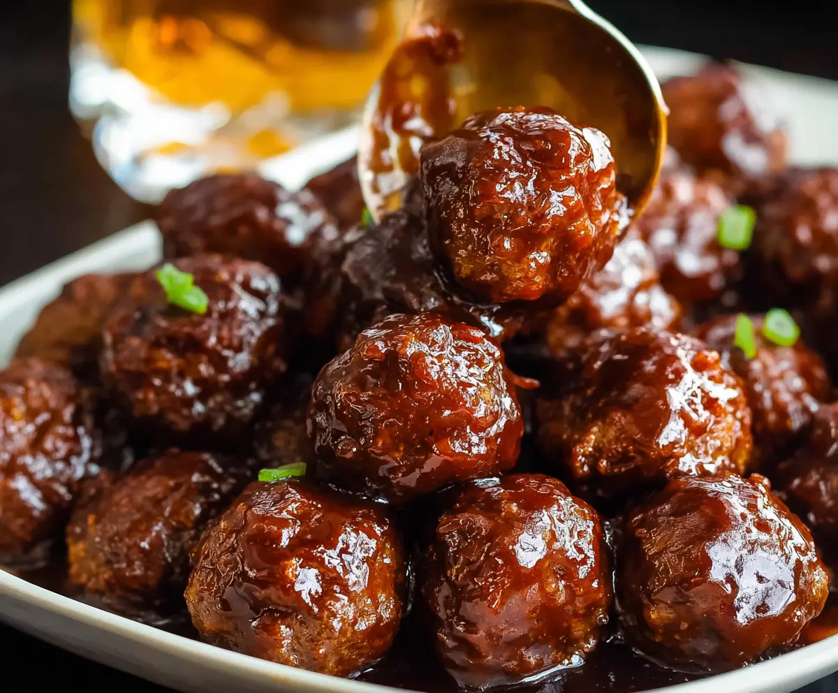Delicious bourbon honey BBQ meatballs served on a platter, perfect for entertaining.