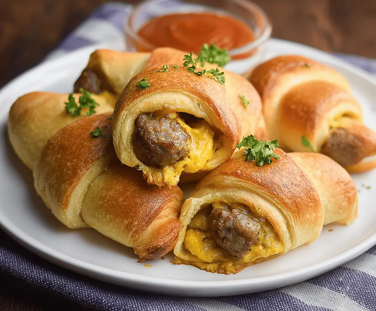 Enjoy your delicious, flaky breakfast sausage crescent rolls that combine savory sausage and melty cheese in a golden, buttery crescent shell! Perfect for a quick and tasty breakfast!
