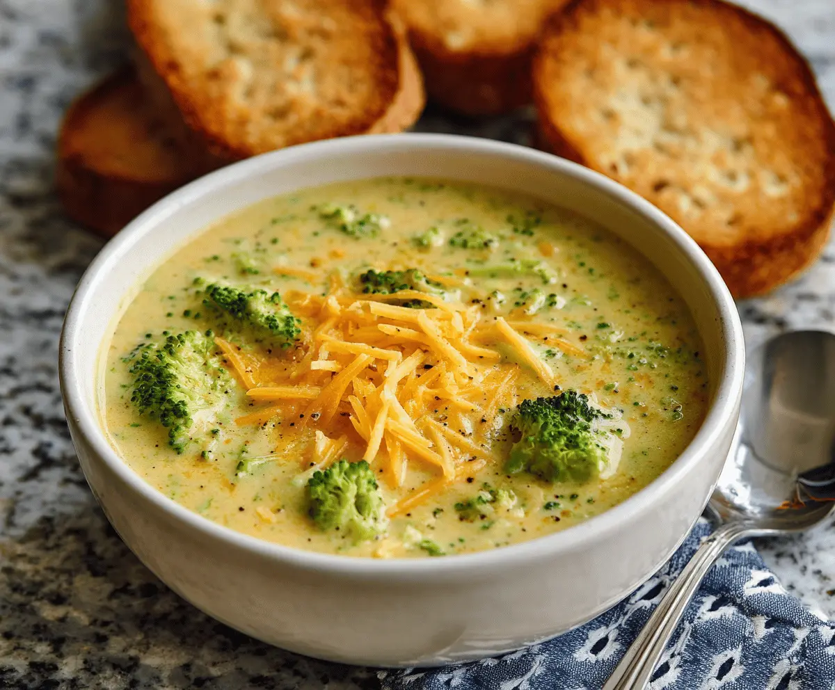 Creamy Broccoli Cheddar Soup in a bowl topped with shredded cheddar cheese and fresh broccoli florets, perfect for a comforting meal.