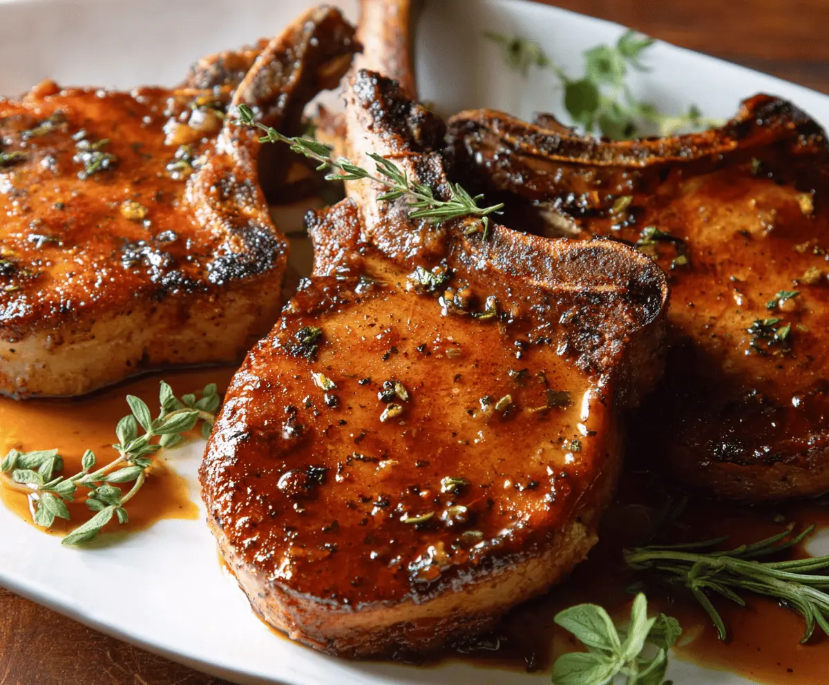 Juicy brown sugar glazed pork chops served on a plate with herbs