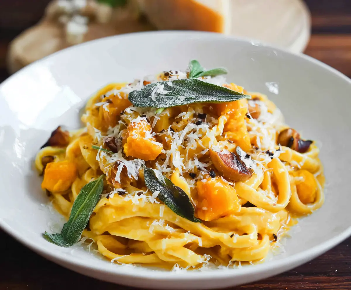 Creamy butternut squash pasta dish with herbs and parmesan cheese.