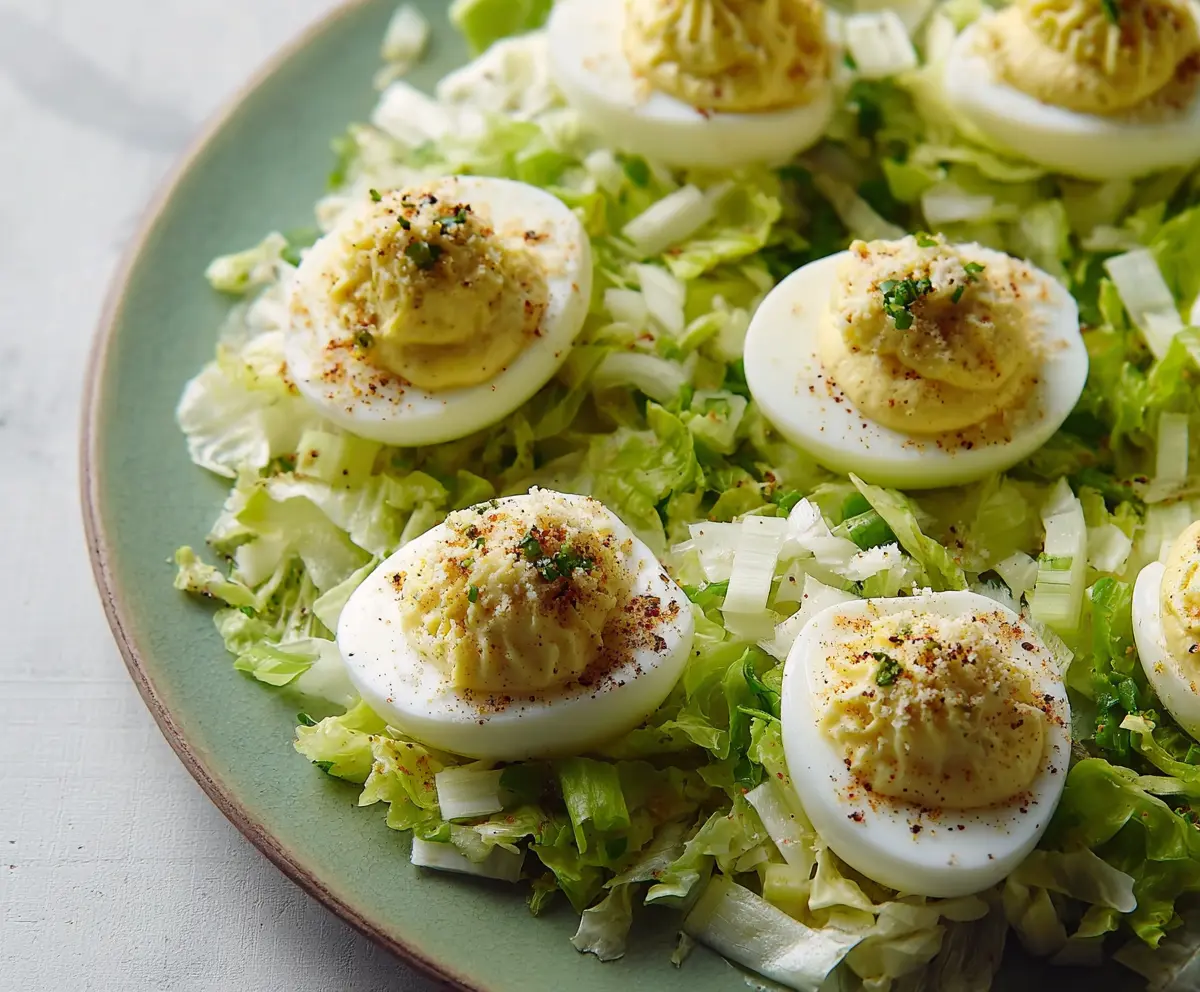 Take a serving platter and line it with chopped romaine lettuce. Arrange the stuffed eggs on top, looking all beautiful and delicious. Sprinkle the deviled eggs with a touch of extra Parmesan cheese and a pinch of smoked paprika for that extra flavor and color.
