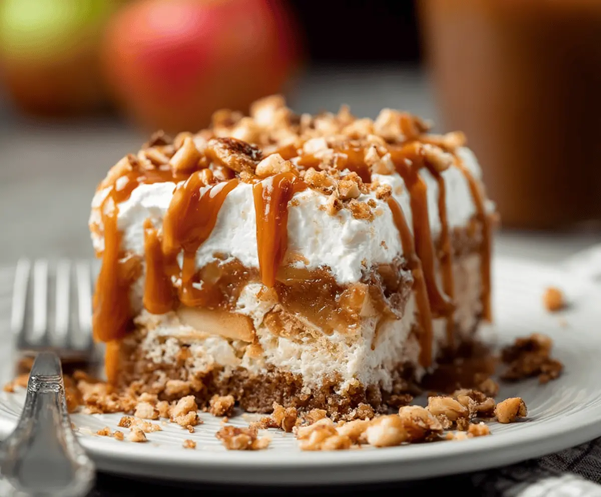 Delicious Caramel Apple Poke Cake topped with caramel drizzle and apple slices, perfect for fall desserts.