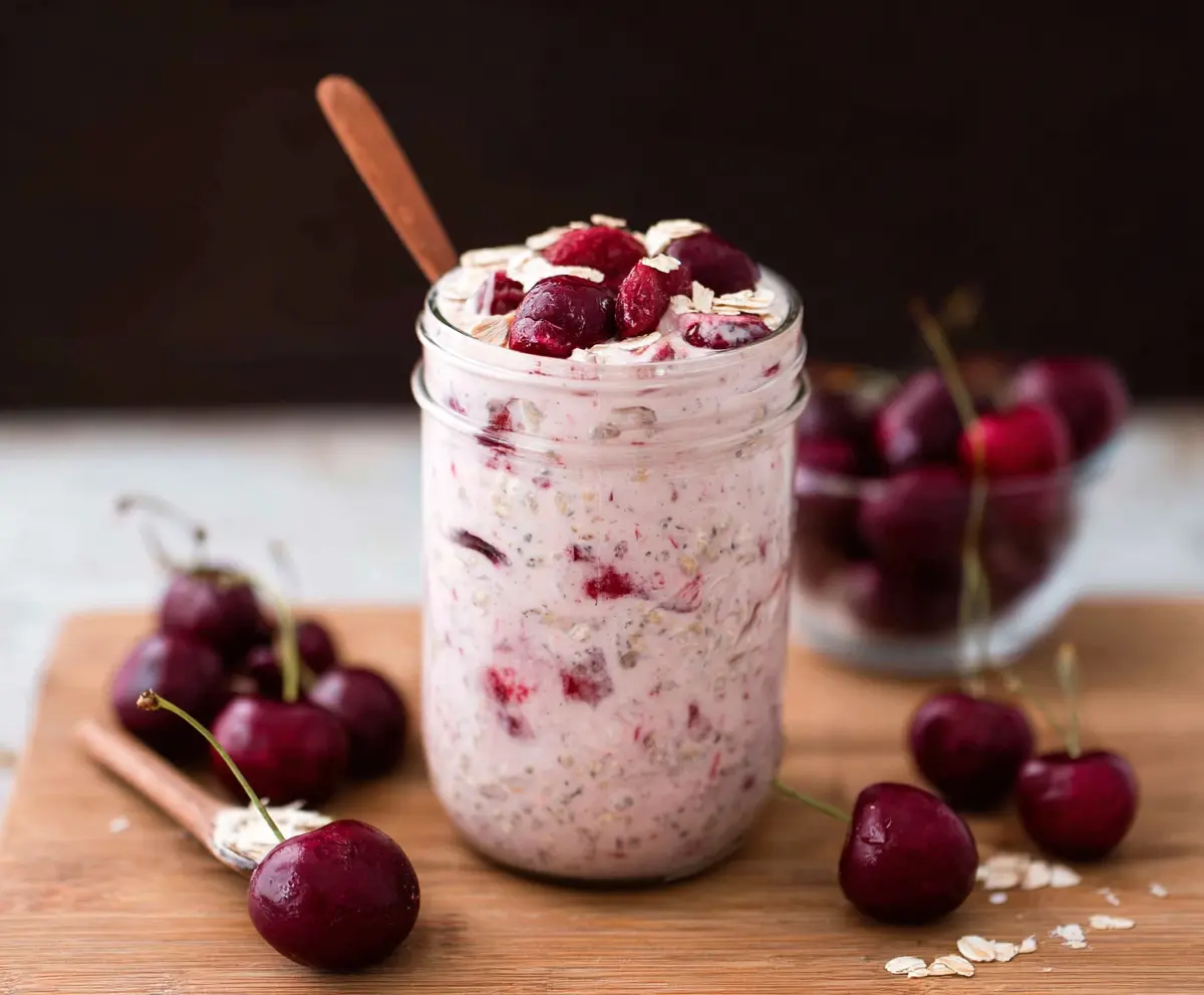 Cherry Overnight Oats are a tasty and convenient breakfast option! Just mix oats, yogurt, milk, and juicy cherries in a jar, then let them soak overnight.