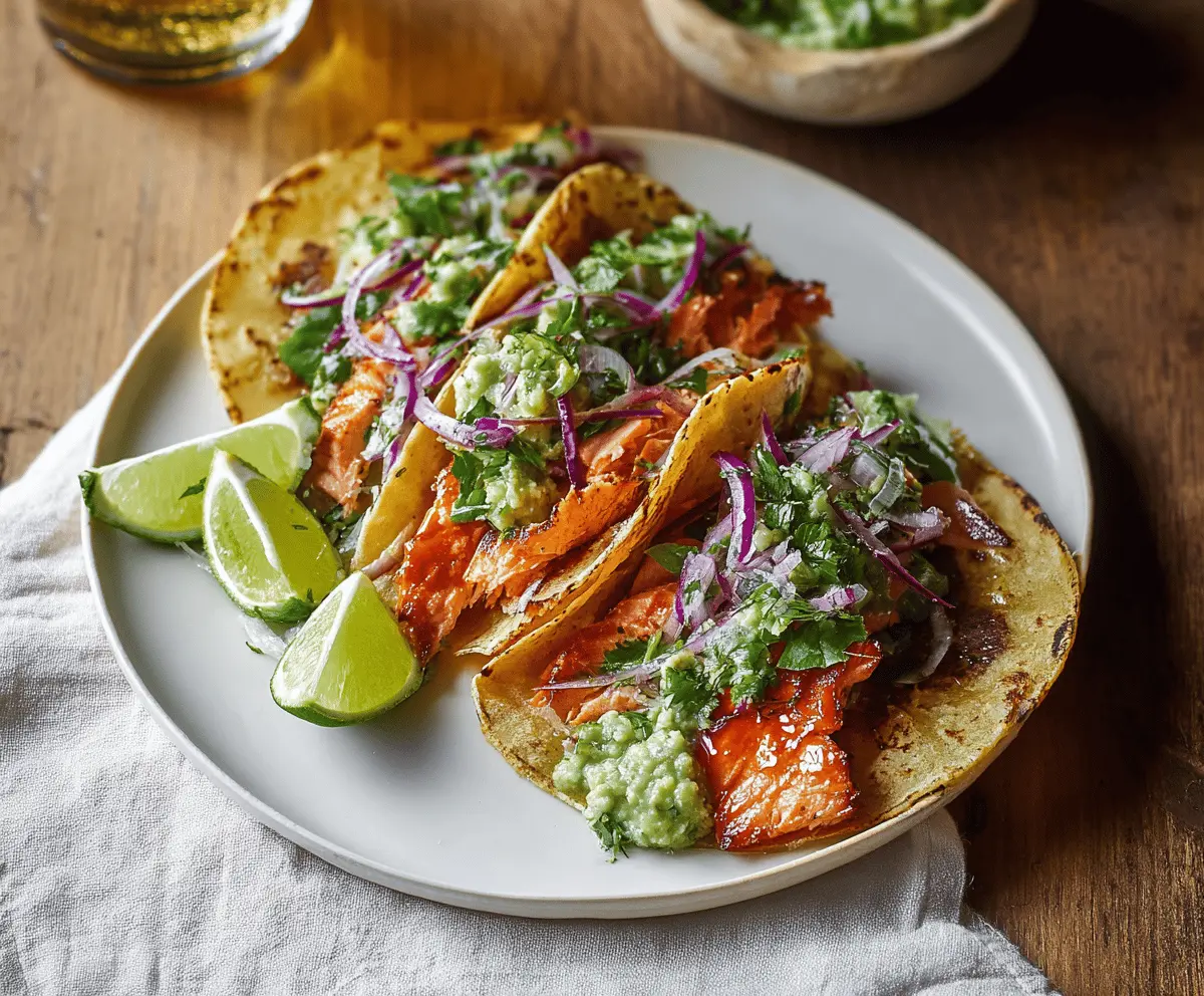 These salmon tacos are perfect for any occasion, bringing together creamy avocado, zesty lime, and tender salmon in every bite. Enjoy your meal!