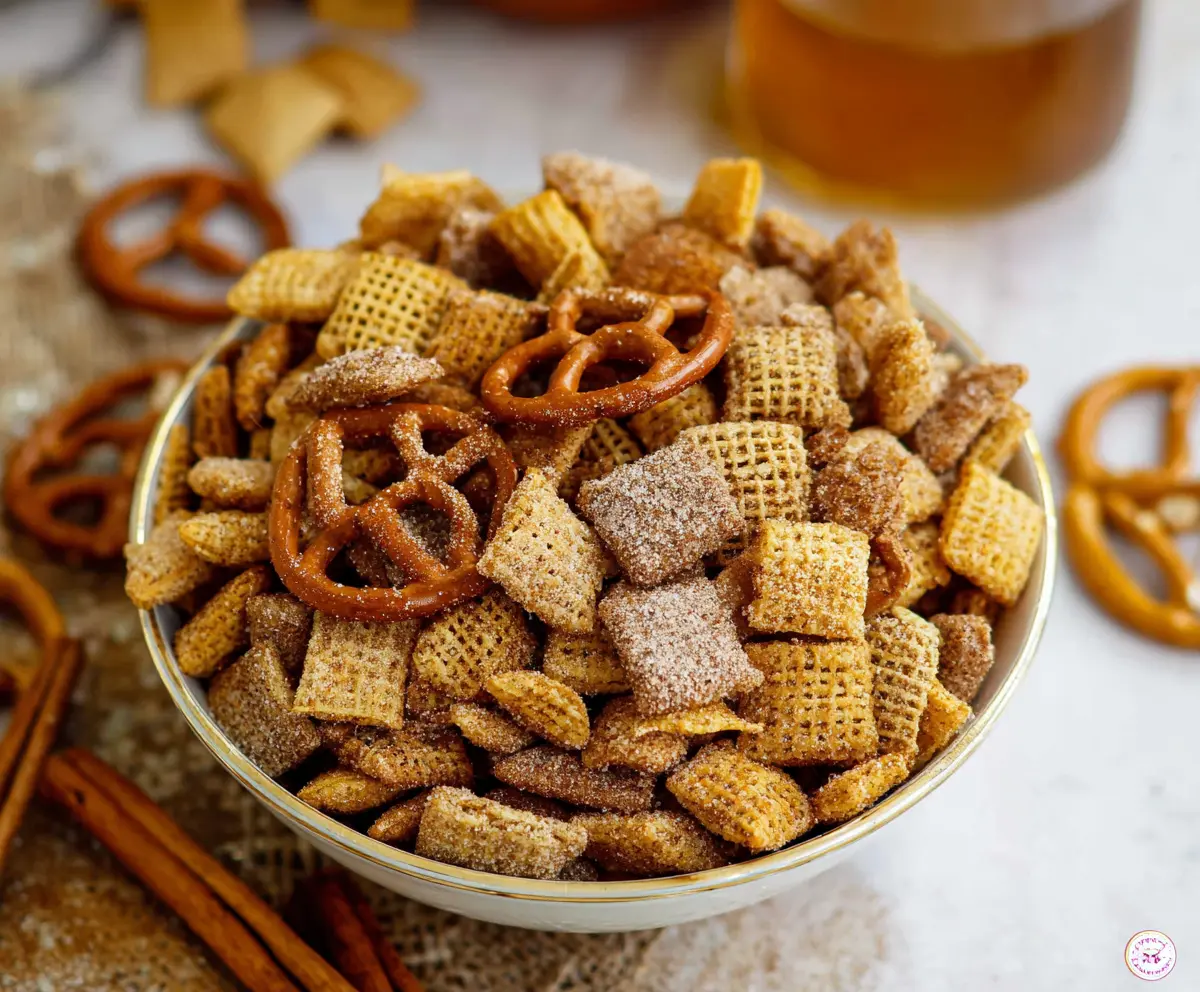 This delightful treat takes about 10 minutes to prep and around 45 minutes to bake. You’ll be enjoying your Cinnamon Sugar Chex Mix in about an hour! Plus, it’s super easy, so it’s perfect for any occasion.