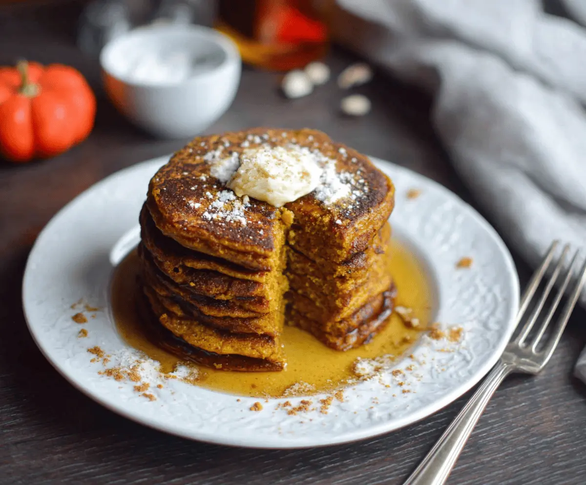 Stack your pancakes on a plate and add a pat of butter on top. Drizzle with maple syrup, sprinkle with cinnamon, and add roasted pumpkin seeds if you like. Serve warm and enjoy your cozy autumn breakfast!