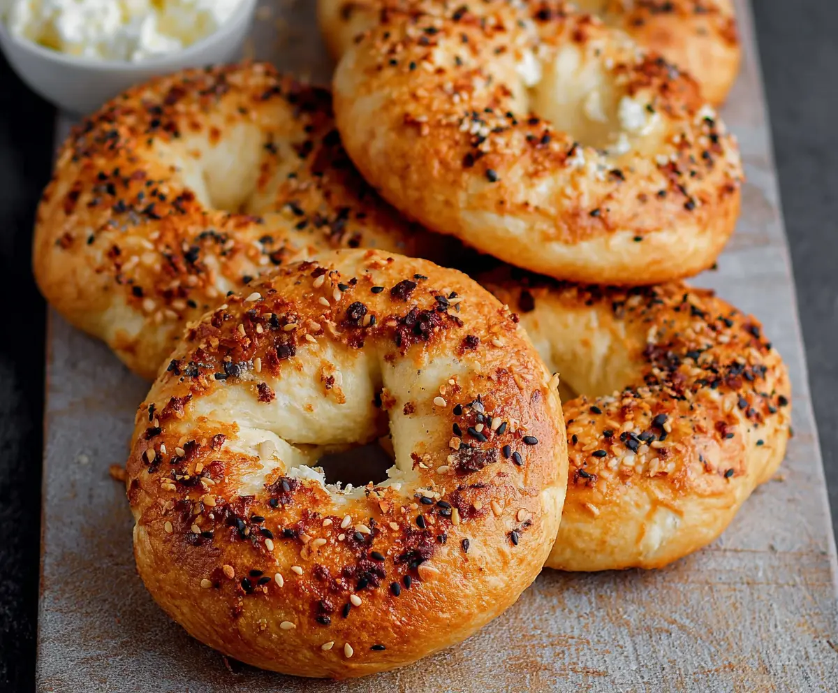 Place the shaped bagels onto your lined baking sheet. Sprinkle the everything bagel seasoning generously over the tops of each bagel. If you want, you can add a few dollops of cottage cheese on top for extra flavor!