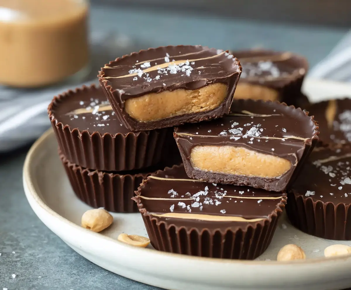These cups have a delightful blend of peanut butter and cottage cheese, all wrapped in rich chocolate with a sprinkle of salt on top—perfect for a healthy yet indulgent snack!