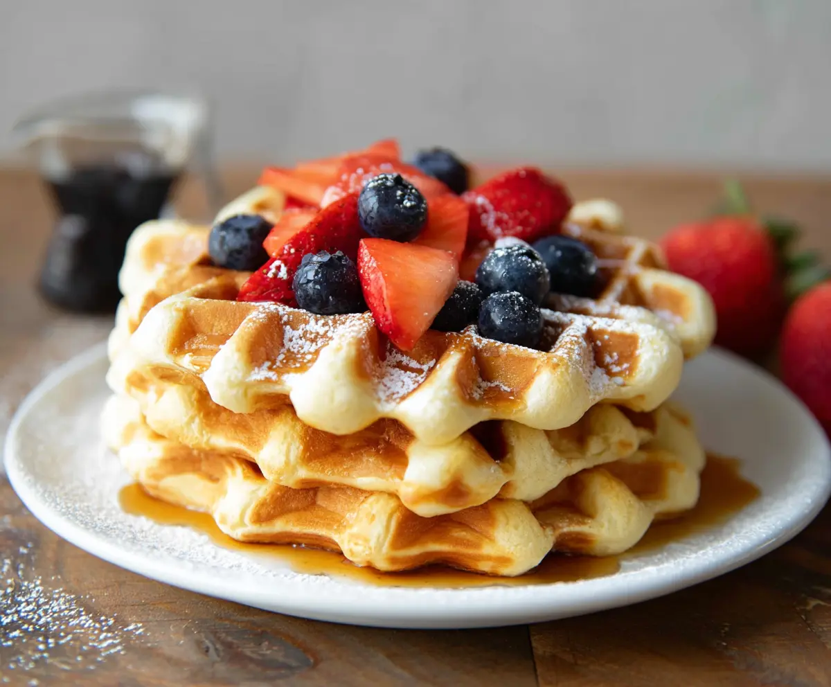 Carefully remove the waffles and keep them warm while you cook the rest. When you’re done, stack them on a plate and top with fresh mixed berries, a drizzle of maple syrup, and a dollop of whipped cream if you like. Enjoy your homemade cottage cheese waffles!