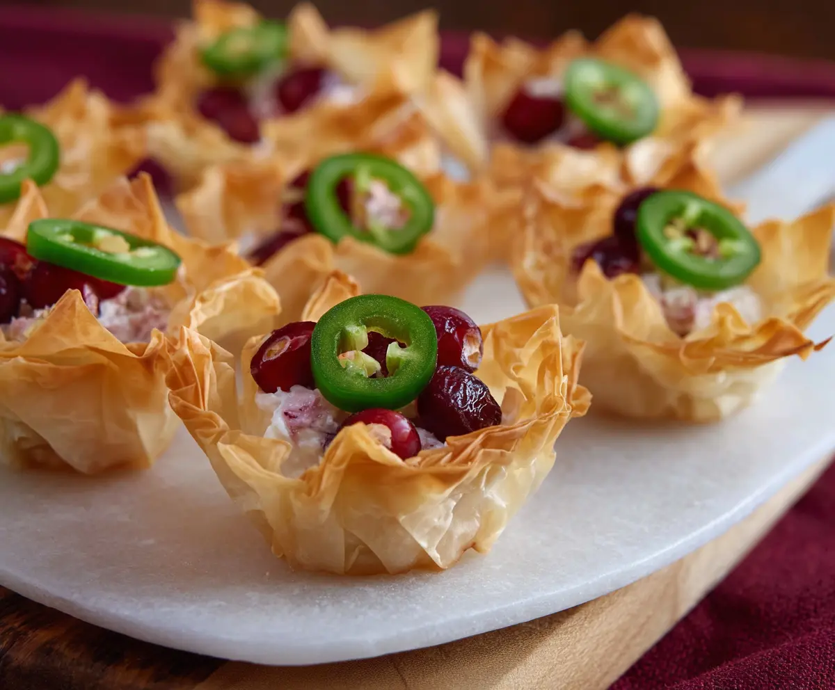 These Cranberry Jalapeno Phyllo Cups are the perfect blend of sweet and spicy. The crispy phyllo shells hold a tasty mix of cranberry and jalapeno that adds a pop of flavor!