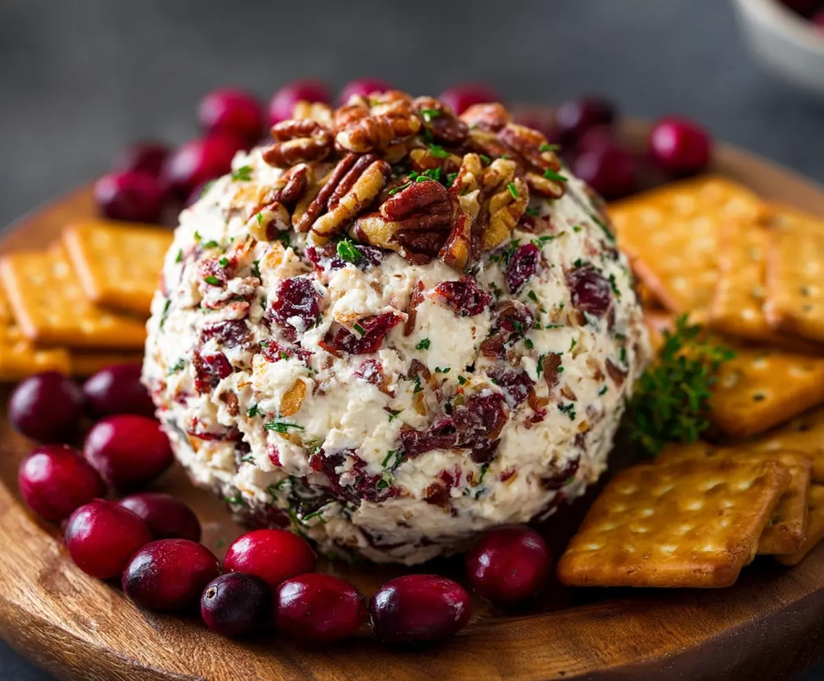 Place your beautifully coated cheese ball on a serving platter. To make it extra pretty, garnish the top with a few whole nuts and cranberries. Now it’s ready to impress your guests!