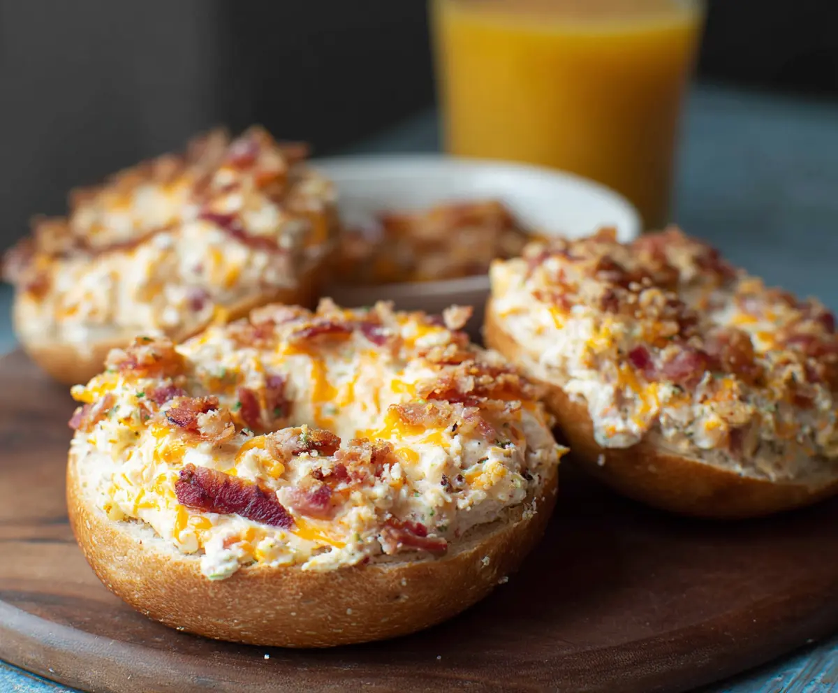 Take the cut sides of each bagel half and generously spoon the creamy bacon cheddar mixture over them. Don’t be shy—load them up!