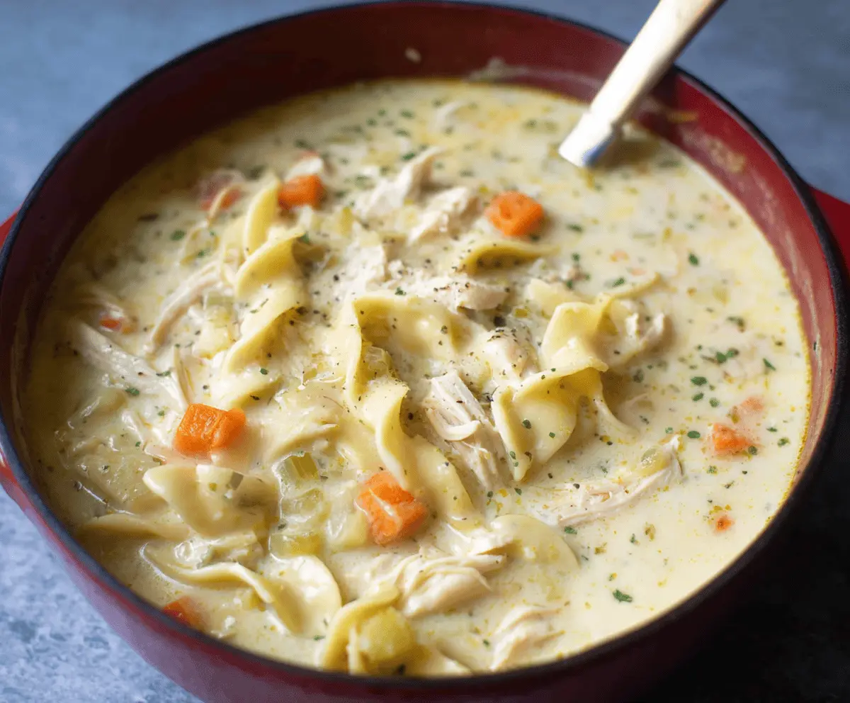 This creamy chicken noodle soup is like a warm hug in a bowl! It’s filled with tender chicken, soft noodles, and a rich, fluffy broth that’s simply comforting.