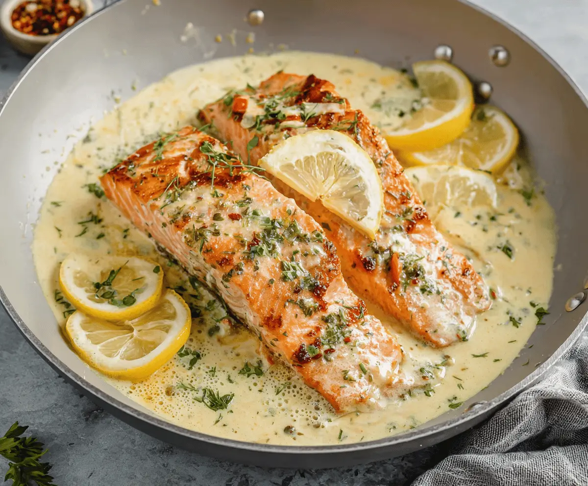 Return the cooked salmon to the pan and spoon the rich sauce over the fillets. Allow it to warm through for another minute. Serve your creamy lemon butter salmon over white rice or alongside steamed asparagus, garnished with lemon slices and extra parsley for a refreshing touch.