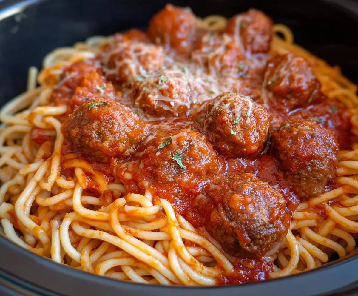 Crockpot Spaghetti and Meatballs is a cozy meal that cooks itself while you go about your day. Tender meatballs and spaghetti simmer in a flavorful sauce, making it a family favorite!