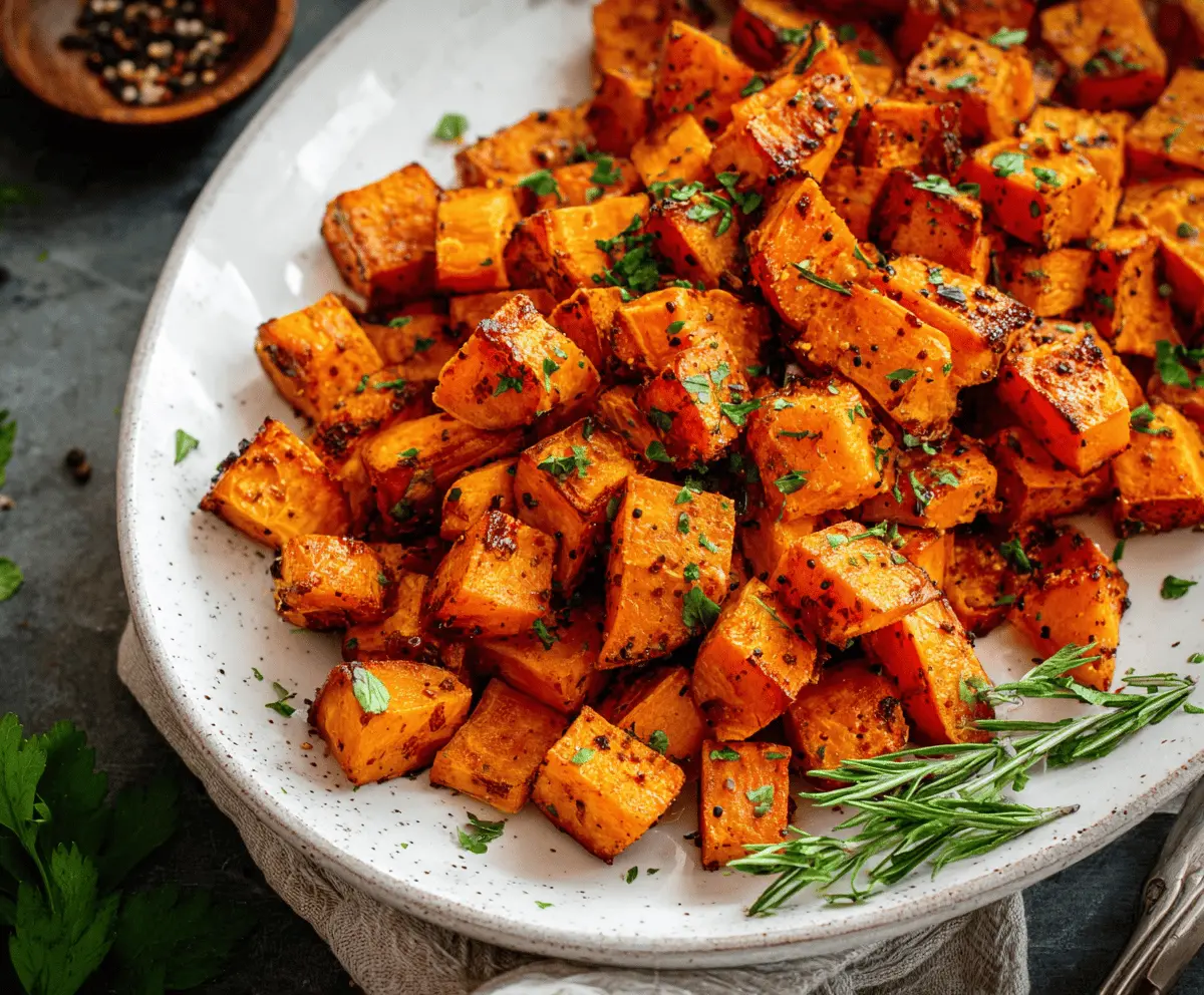 These crunchy roasted sweet potatoes are the perfect mix of sweet and savory! Tossed with olive oil and spices, they get nice and crispy in the oven, making them super tasty.