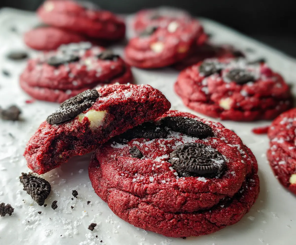 These Crushed Oreo Red Velvet Cookies boast a stunning red color with creamy white chocolate swirls and bits of crunchy Oreos, making them a delightful dessert for any occasion!