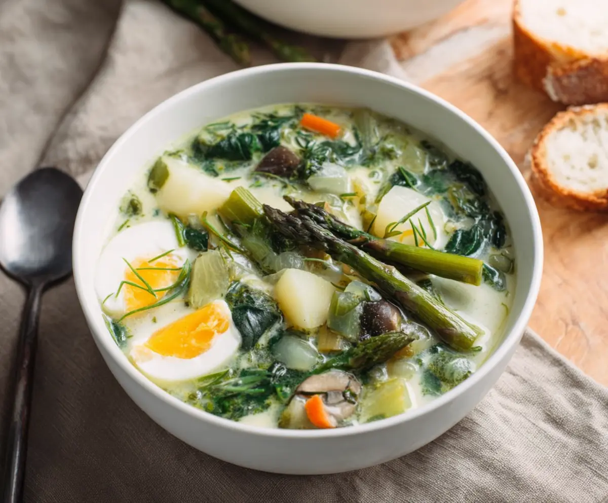 This bright and creamy soup is perfect for a cozy meal, especially during spring. Bon appétit!