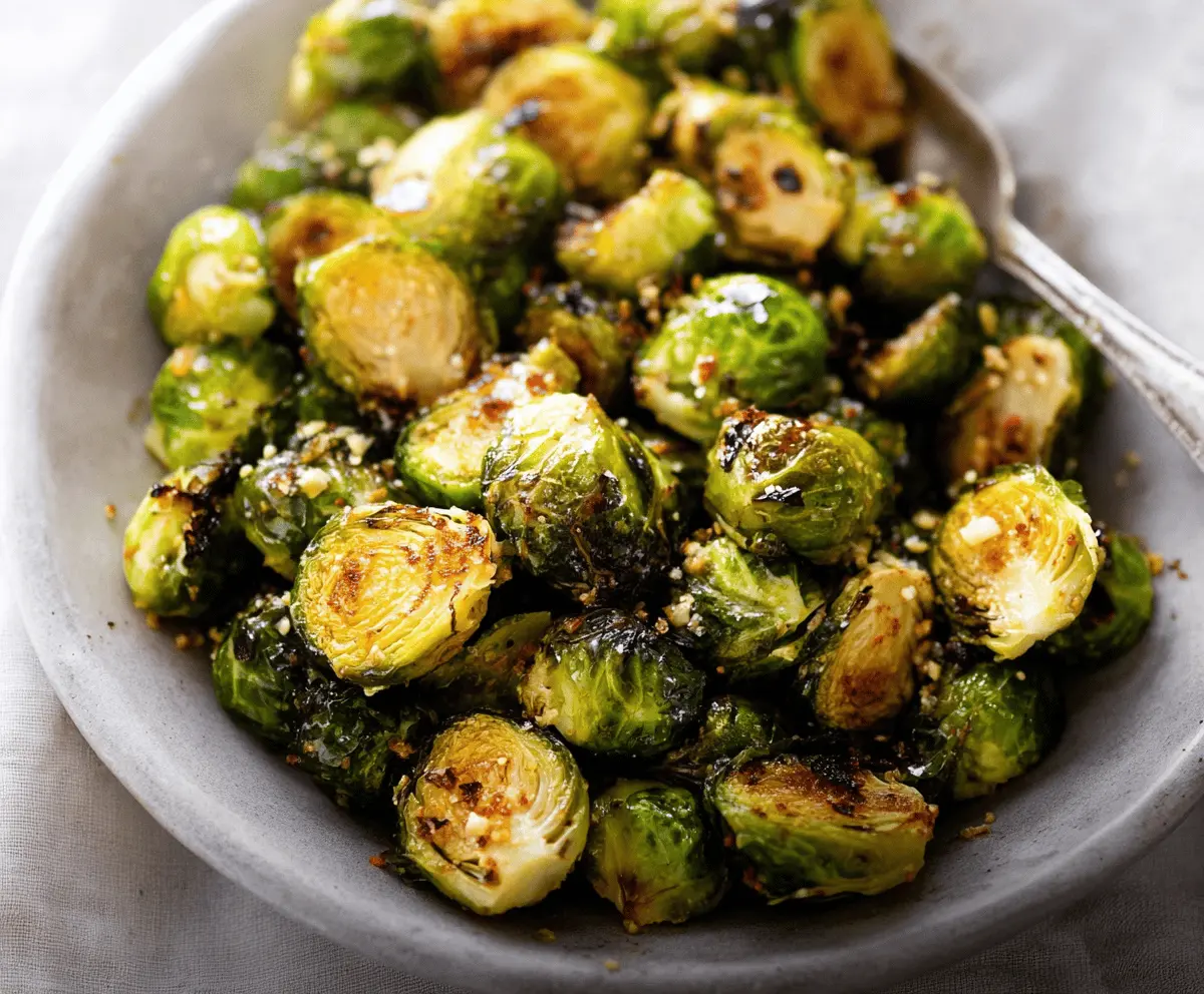 Delicious garlic butter roasted Brussels sprouts served on a white plate, garnished with fresh herbs and a crispy, caramelized exterior.