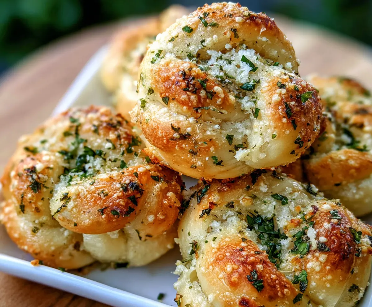 Golden Garlic Parmesan Knots fresh out of the oven, garnished with herbs and cheese
