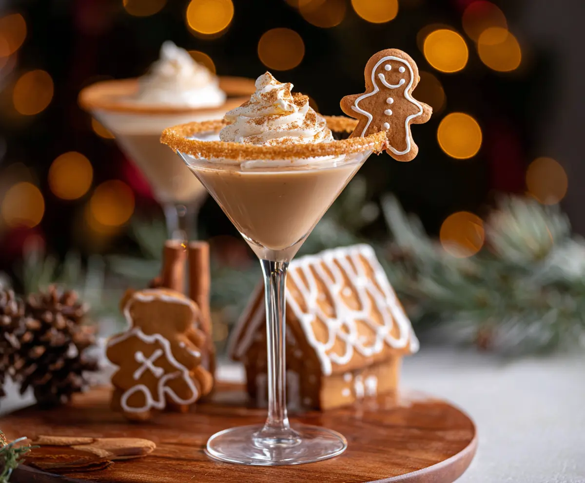 Finally, garnish each glass with a mini gingerbread cookie on the rim and, if you like, sprinkle a bit of ground cinnamon or nutmeg for an extra festive touch.