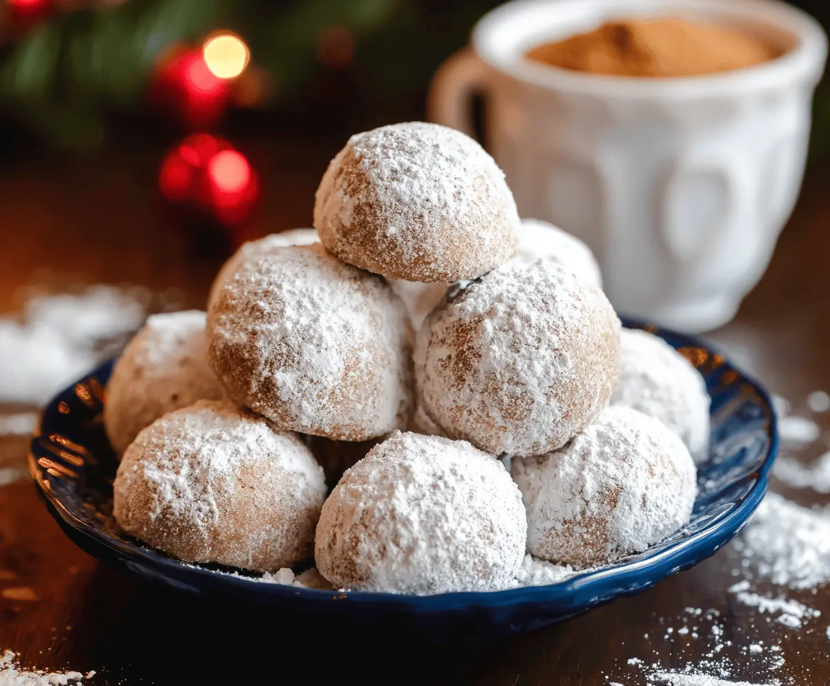 Delicious gingerbread snowball cookies covered in powdered sugar on a festive plate.