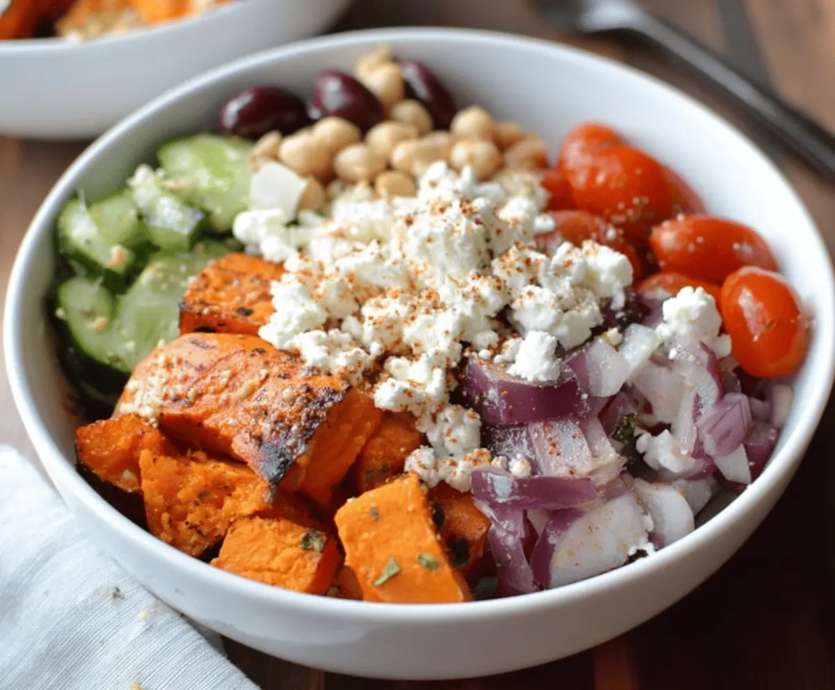 These Greek Sweet Potato Bowls are a colorful mix of roasted sweet potatoes, crunchy veggies, and creamy feta cheese. It’s a healthy treat that looks as good as it tastes!