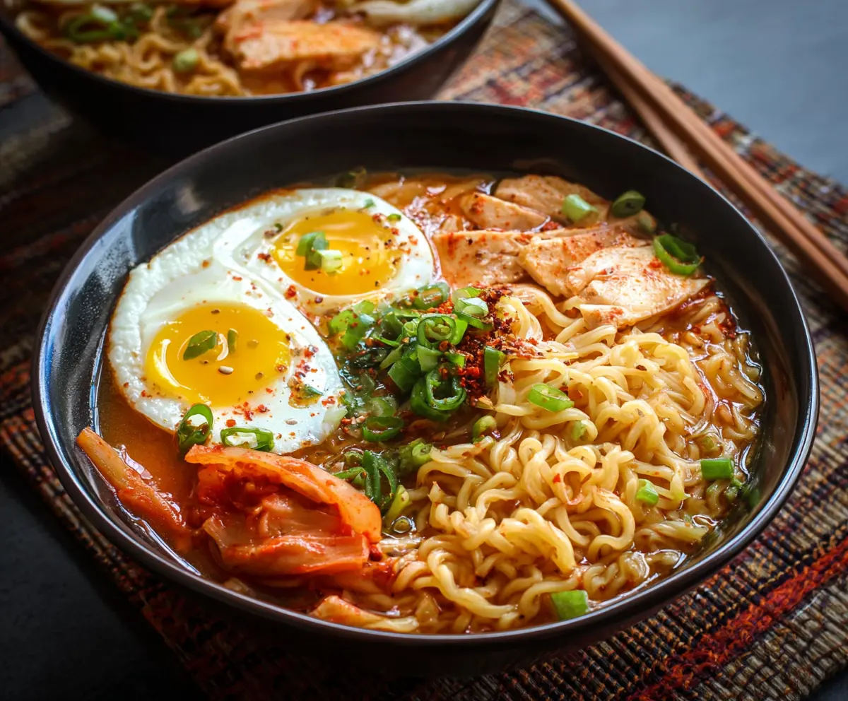 Garnish each bowl with halved soft-boiled eggs, kimchi, sliced green onions, and a sprinkle of toasted sesame seeds for crunch.