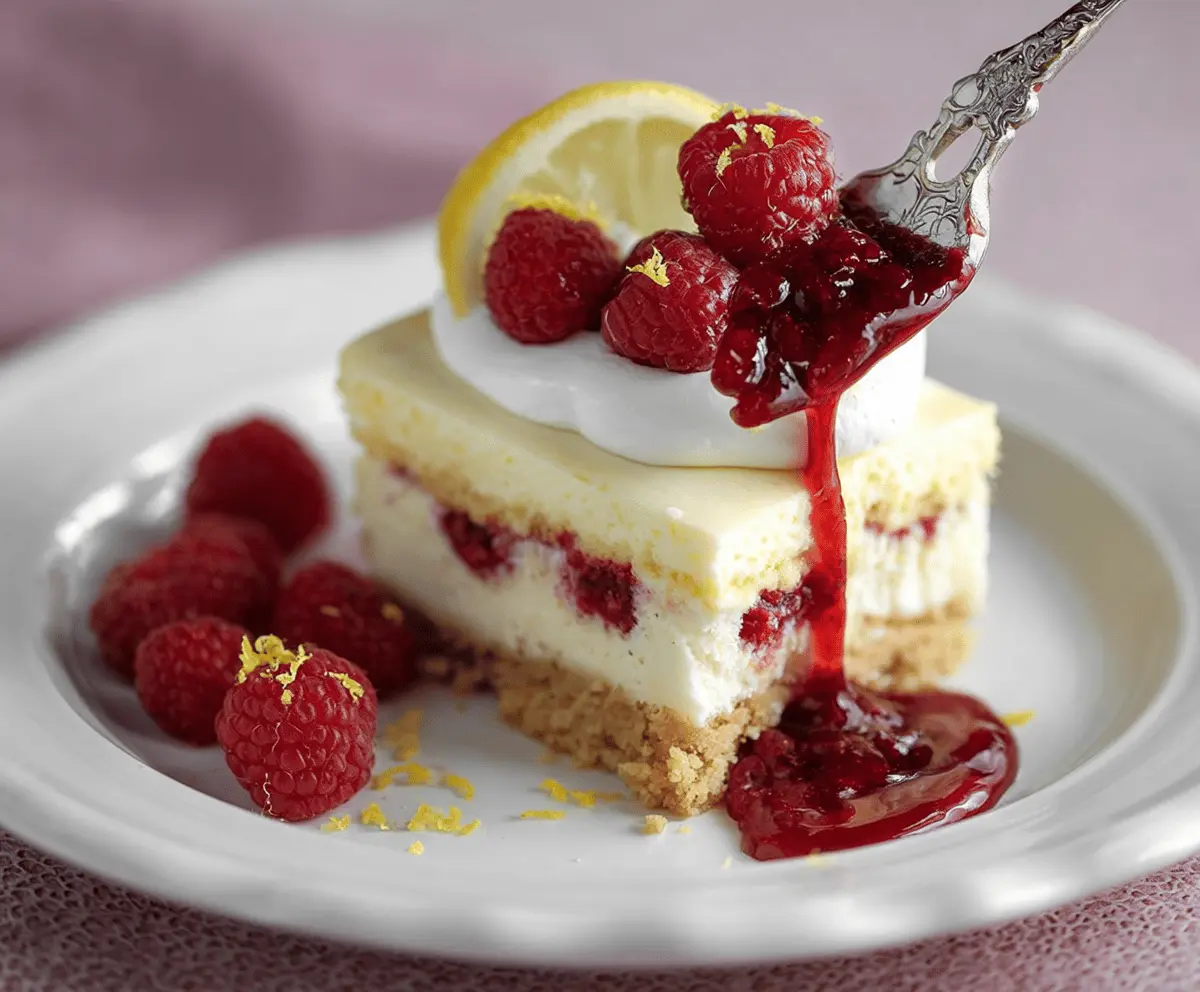 Enjoy this delightful creamy lemon cheesecake bursting with fresh raspberry flavor—a perfect treat for any occasion!