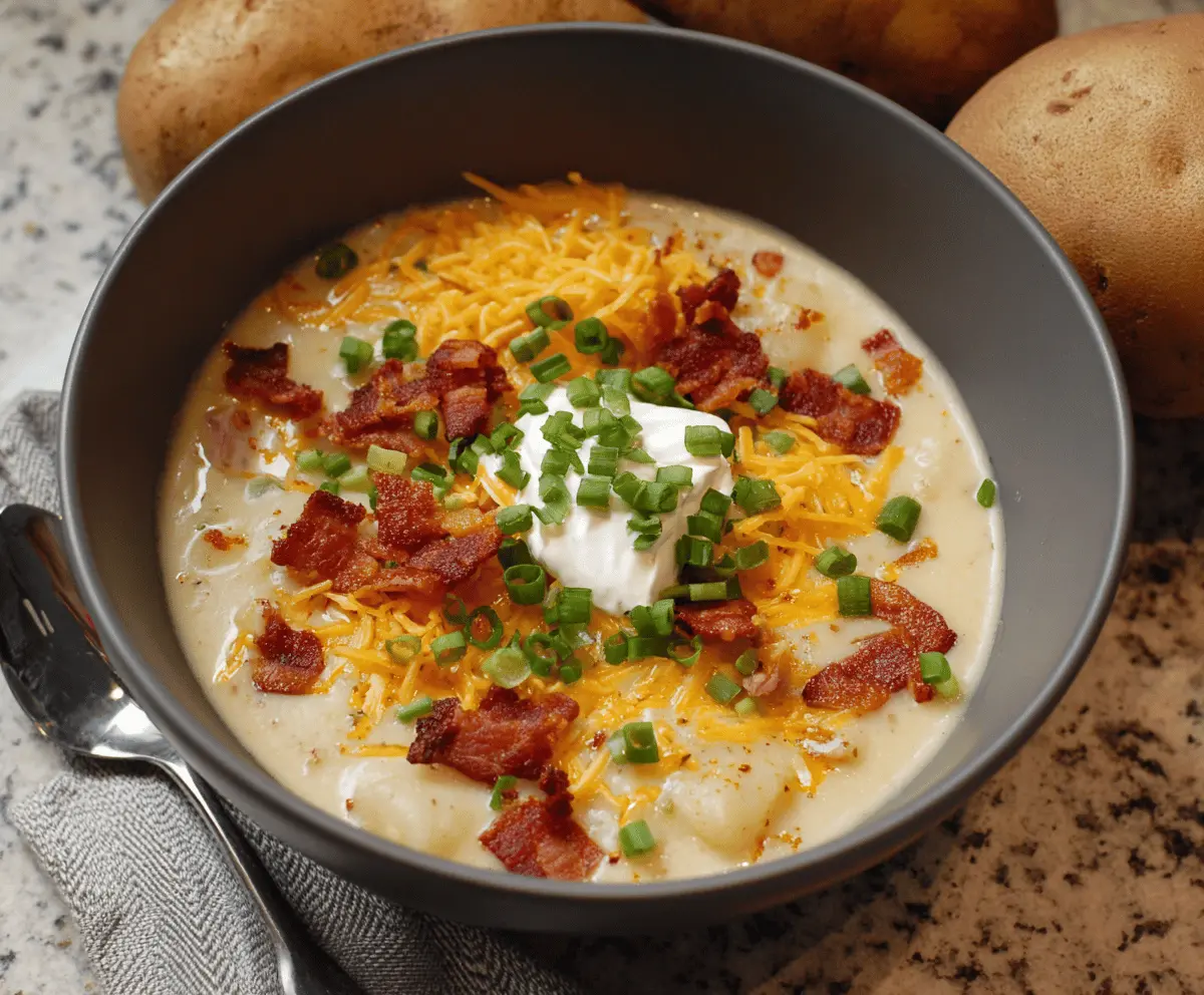 Creamy loaded baked potato soup topped with shredded cheese, crispy bacon bits, chopped green onions, and a dollop of sour cream in a rustic bowl.