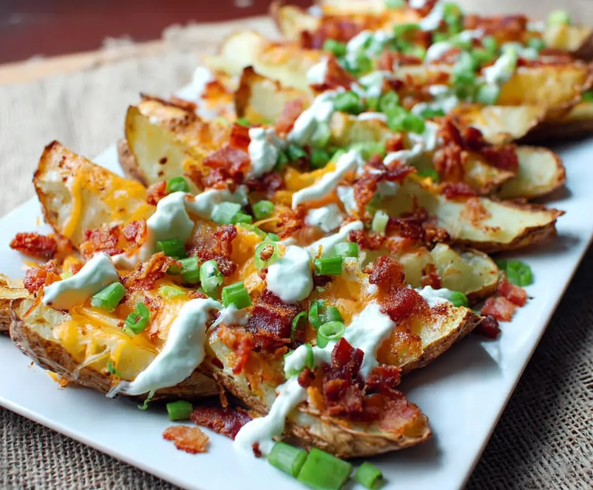 Delicious loaded baked potato wedges topped with cheese, bacon, and green onions ready to serve.