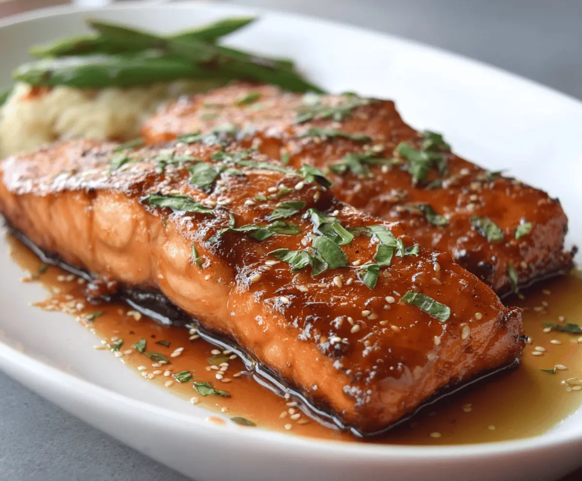 In the last minute of cooking, brush the salmon with a little more glaze to achieve a lovely sticky and shiny finish. Finally, sprinkle toasted sesame seeds over the salmon and garnish with freshly chopped herbs to add flavor and color.