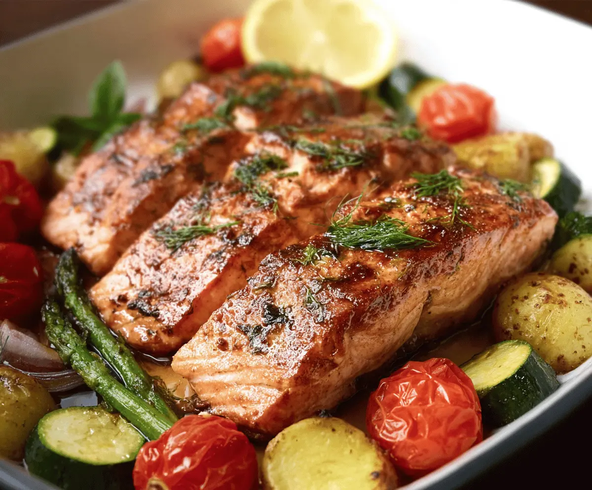 Once baked, carefully remove the dish from the oven. Sprinkle fresh dill over the salmon and vegetables for that extra burst of flavor.