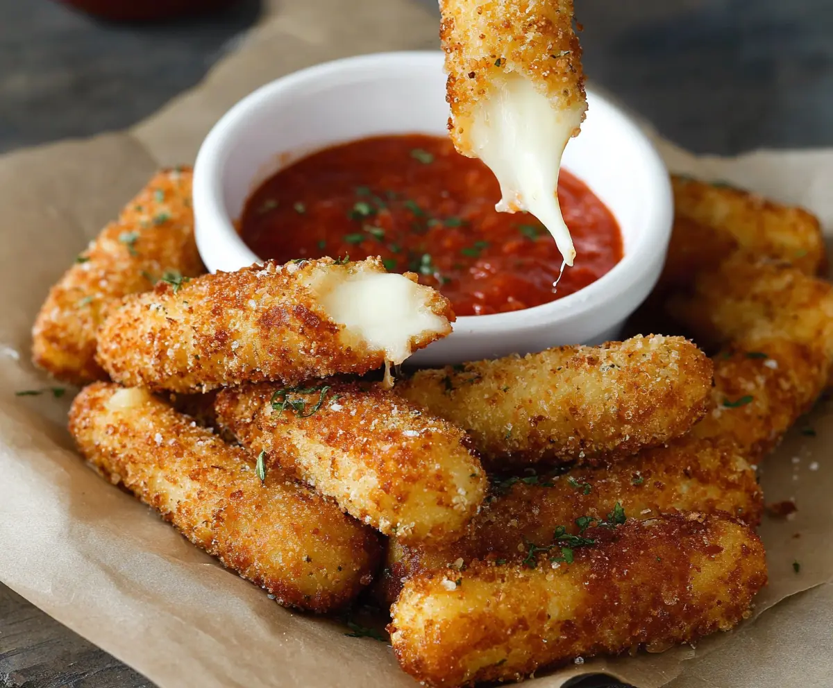 Serve the mozzarella sticks hot with warm marinara sauce for dipping. Take a bite and enjoy that beautiful combination of crispy outside and melty cheese inside!