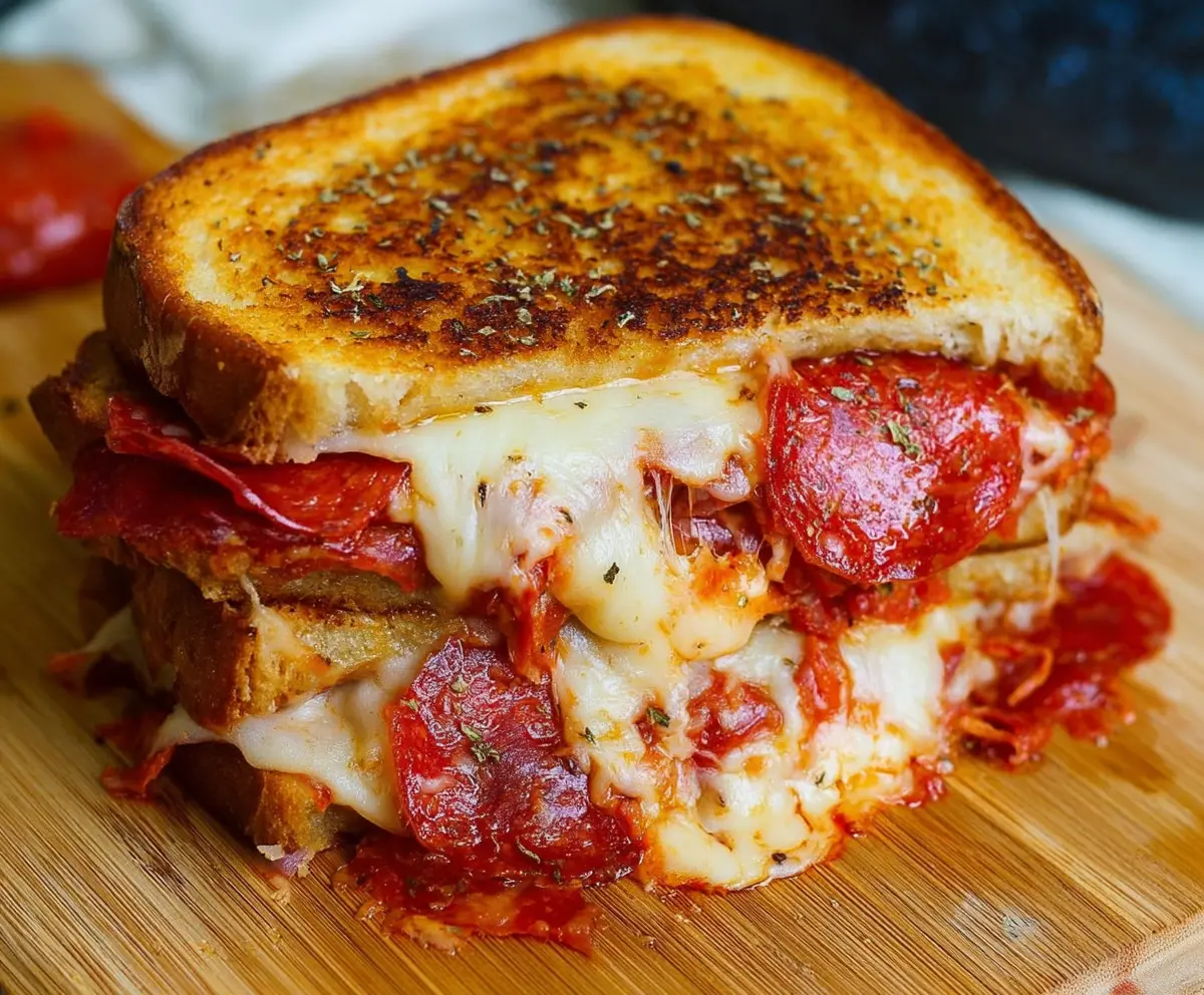Delicious pepperoni pizza grilled cheese sandwich with melted cheese and crispy bread.