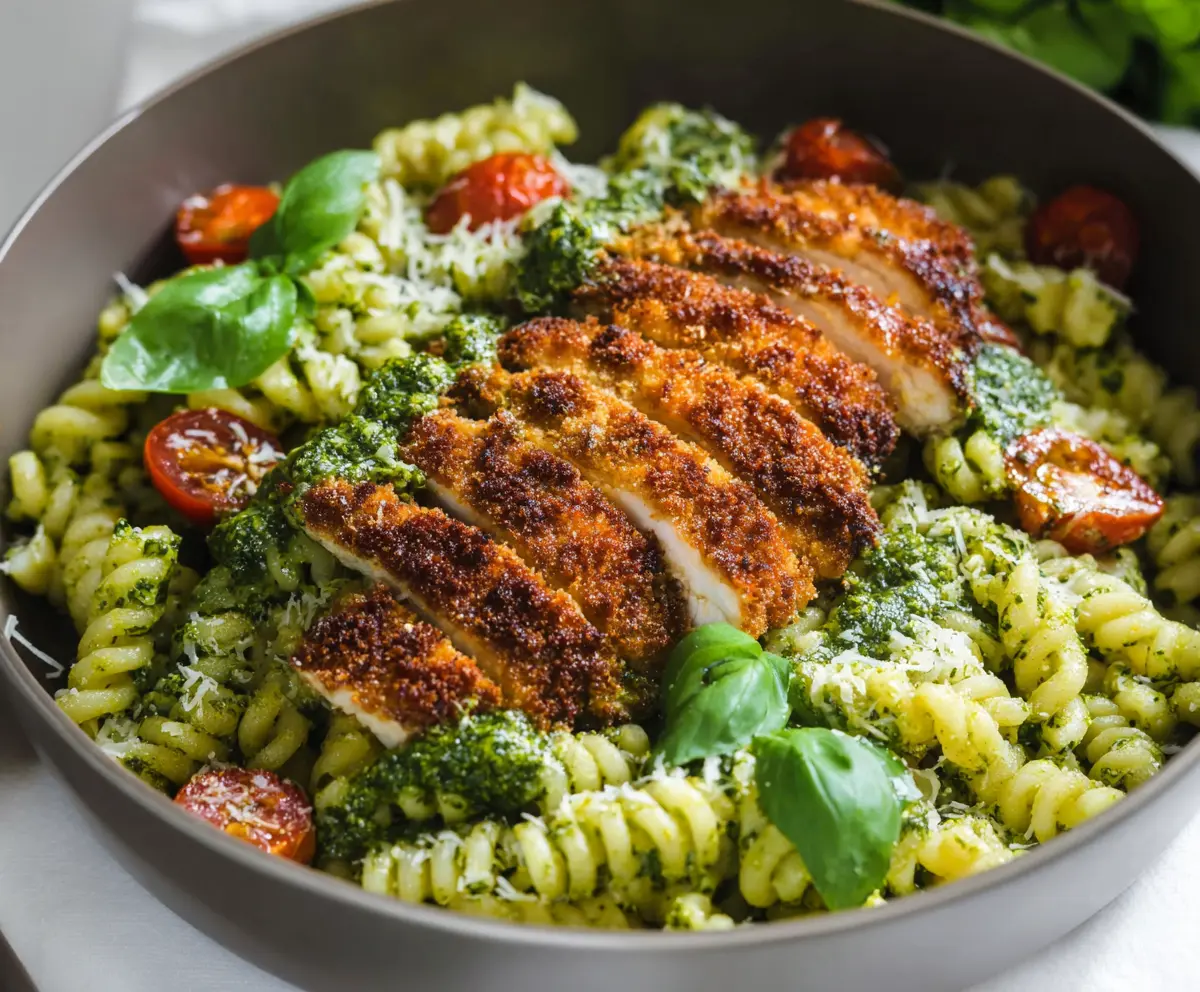 On a plate, serve a hearty portion of the pesto pasta. Lay the sliced crispy chicken right on top for a beautiful presentation. Garnish with halved cherry tomatoes and fresh basil leaves for a pop of color.