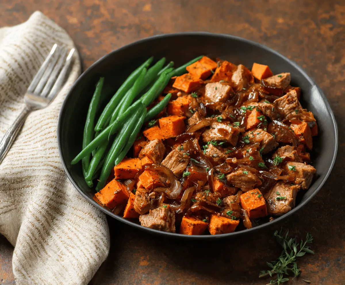 Plate the delicious pork and sweet potato mixture alongside steamed green beans or your favorite green veggie. Garnish with fresh thyme or rosemary sprigs for a lovely finish. Enjoy your hearty one-pan meal!