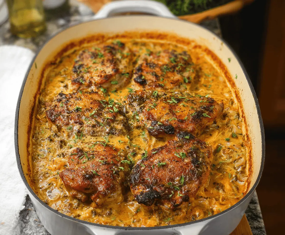 Next, pour in the chicken broth and heavy cream into the skillet, stirring everything together. Sprinkle in the dried thyme and paprika, and let this mixture simmer for 2-3 minutes until it begins to thicken slightly.